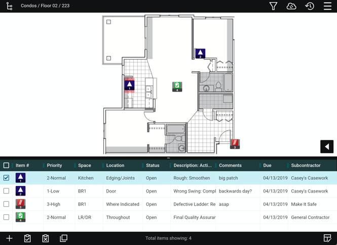 When punch list items are created in a specific room of an apartment unit or condo, the data collected for the item recognizes not only the unit number; it recognizes the specific room in the unit. This kind of data collection is especially valuable for project managers who need to pin down issues, such as – why are vanity light fixtures in the master bathrooms of all Type 5 units requiring replacements?