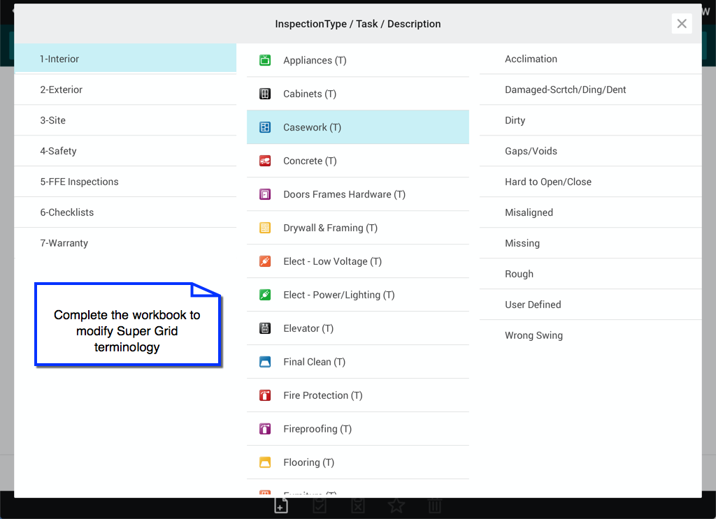 3) Submit setup materialsSend your project drawings and the completed workbook to the FinishLine team. For example: you can make modifications to the Inspection Types, Tasks, and Descriptions in the "Super Grid" (pictured below).
