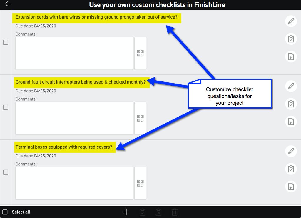 Use pre-configured checklists in FinishLine or use your own custom checklists - it's up to you!