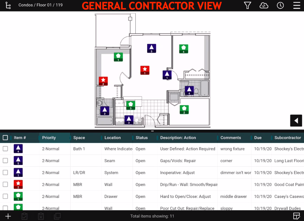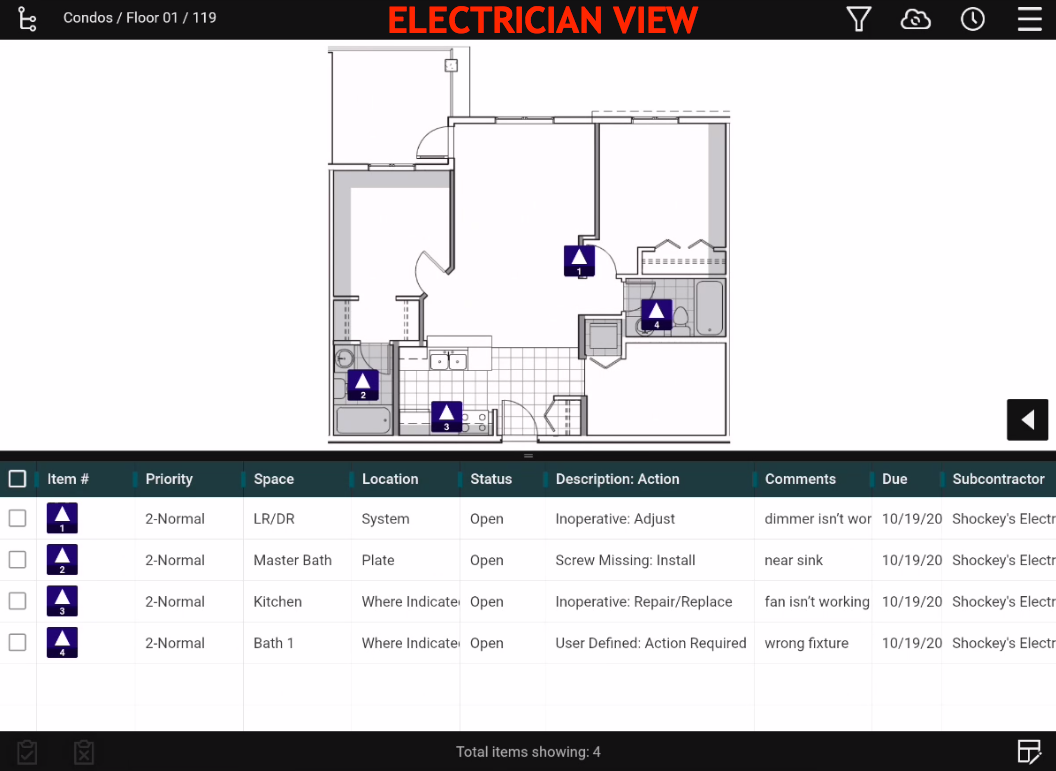 What each user views in FinishLine is simplified, based on their responsibilities. For example, a subcontractor such as an electrician can only view their items. Since general contractors need to see all items, they have a comprehensive view of outstanding items.