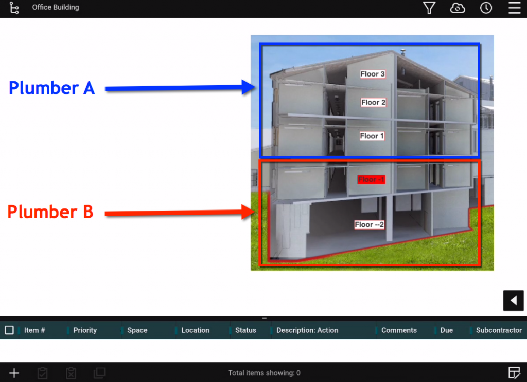 Have a large project with multiple subcontractors for the same trade? During project setup we can assign specific subcontractors to work in particular areas or specific buildings. For example, one plumber will only be assigned to particular floors, while a different plumber can only see items on the other floors.